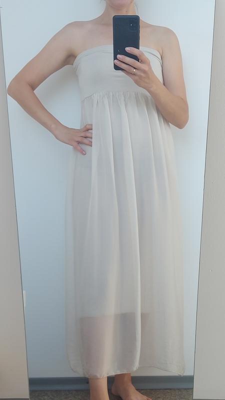 Просто невесомое шелковое платье в молочном цвете. Подкладка вискоза, верх 100% шелк. Вискоза очень хорошо тянется, поэтому подойдет на размер от XS до М. длина полностью 115, длина шелковой юбки 95