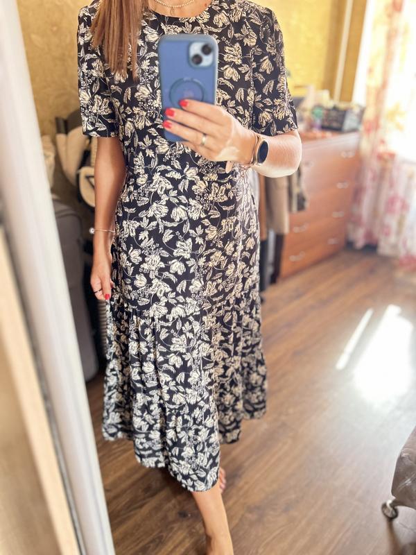 Дуже гарна, легка сукня, не жарка, в ідеальному стані. Є тоненький пасок, внизу рюши, які дуже гарно виглядають. НОГ -57, НОТ -52, НОБ -60, довжина - 120, ширина плеч -43.