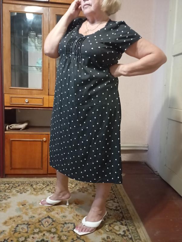 Великолепное черное летнее платье с принтом сердечек размер L. Замеры: ПОГ-55, бедра -65, длина -110. 100%-котон. Состояние новой вещи у шейи вывязано черное кружево, на груди защелки. Я меряю на XXL, мне комфортно.