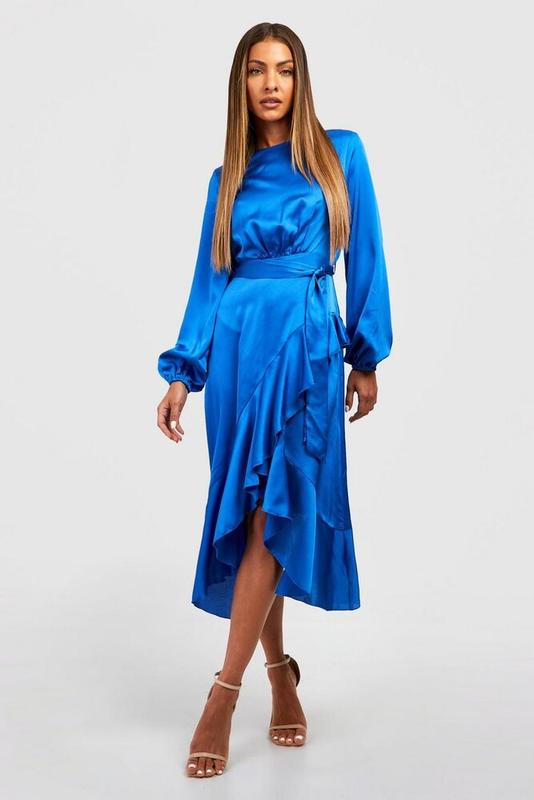 Стильное женское платье из плотного атласа в насыщенном красивом цвете неба. Криволинейный Подол с уборками пышные рукава завлажне к поясу с пуговицами от пояса короткая молния. состояние новой вещи! на спине оторвался пуговица, запасной на бирке. рукав 62, длина до 125, пог до 50, пояс не тянется 38, бедра до 55.