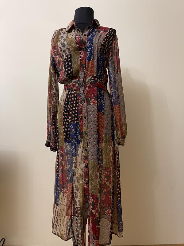 Жіноча сукня - сорочка міді з напівпрозорого поліестеру. Плечі 41 см, ПОГ 47 см, ПОТ 34 см, тягнеться до 42 см за рахунок гумки на спині, ПОС 59 см, довжина до талії 36 см, загальна довжина 116 см, рукав 59 см. Стан ідеальний, без дефектів.