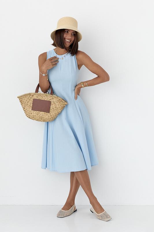 ЗАМІРИ ВИРОБУ Ширина під проймами рукавів (над грудьми), см S - 40см; M - 42см; L - 44см Ширина по стегнам S - 54см; M - 56см; L - 58см Ширина по талії/поясу, см S - 35см; M - 37см; L - 39см Довжина виробу, см S - 109см; M - 109см; L - 109см РОЗМІРНА СІТКА ХАРАКТЕРИСТИКА ТОВАРУ Країна Туреччина Тканина Віскоза Склад тканини 65% віскоза, 35% льон Параметри моделі 84*60*92 зріст 173 Розмір на фото S ОПИС АРТ. 512 Сукня довжини міді без рукавів — це елегантна класична модель, що підкреслює жіночний силует і пасує для різних подій. Має приталений верх до талії з виточками по всій довжині, які формують витончений об’єм і надають акуратної посадки. Від талії сукня плавно розкльошується донизу, створюючи м’який і романтичний силует. Неглибока округла горловина додає стриманості, а закрита спинка із потайною блискавкою по центру зберігає чистоту ліній та зручність у носінні. Ідеально поєднується з класичними босоніжками, балетками чи жакетом — для офіційних подій, вечірніх виходів або щоденного витонченого образу.
