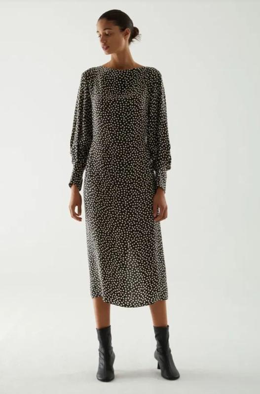 Платье от COS. Черно-молочная палитра. Абстрактный принт, вырез горловины лодочка рукав с манжетом на пуговицах, молния сзади, объемный рукав. Элегантный, непринужденный и шикарный силуэт. 100% тканина купро.
