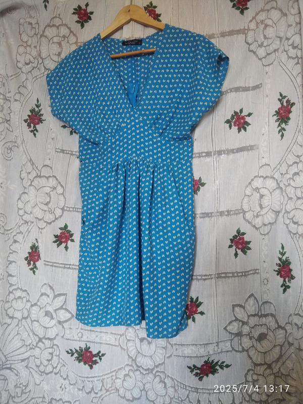 Супер стильное платье голубого цвета с желто-белыми пушинками,обрезное в талии,ширина в талии-35см., спереди на груди красивая треугольная вставка, сзади на талии завязывается шикарный бант на широком поясе, от талии до низа спадают складки, крайне необходимые складки переходят в кармане, длина платья-85см.