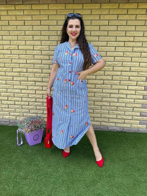 Модель 855VL Ткань: коттон, вышивка Принт полоска и размеры : 46-48 красный(4) 50-52 голубой (9), синий (8) 54-56 голубой (13), синий(8),, красный (6) 58-60 синий (13), голубой (1), красный (1), Платье-рубашка в пол, идеальная посадка, красный пояс подчеркивает фигуру; красные пуговицы на рукавах, в ряд до груди, красный пояс в комплекте; платье застегивается на пуговицы до талии ; короткий рукав с патиком с пуговицей; по бокам карманы с карманами пуговицами; на платья по бокам разрезы.Параметры модели 108-86-110, рост 165см, на ней представлен 50-52. Параметры внешнего шва изделия: 46-48: ОГ98, ОТ102, ОБ108, рукав 20см, длина 134см. 50-52: ОГ106, ОТ108, ОБ118, рукав 21, должком 136; 54-56: ОГ 114, ОТ118, ОБ124, рукав 22, длина 137; 58-60: ОГ122, ОТ124, ОБ130, рукав 23, длина 138см.