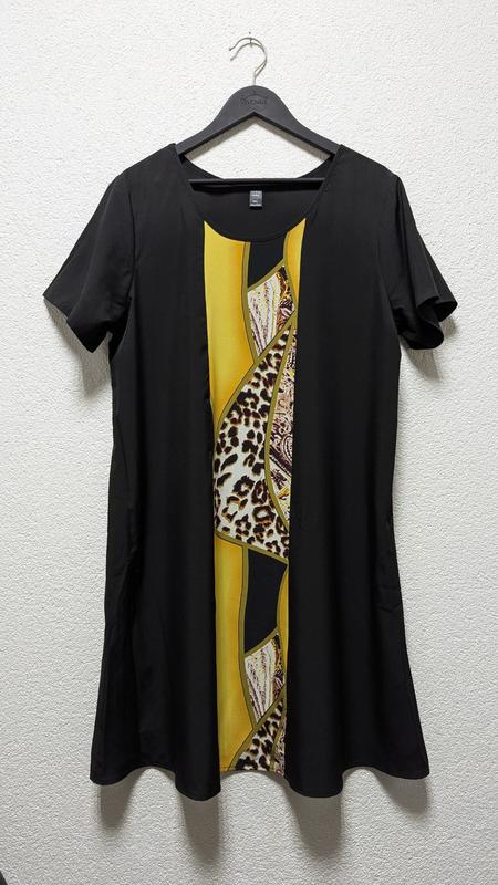 Платье-футболка черного цвета с желтой полоской посередине. Внутри полоски есть несколько секций с животным (леопард) принтом. Размер: 0XL Состояние: идеальный. Нет никаких повреждений и дефектов. Материал: 100% полиэстер Замеры: ■ длина спереди - 85 ■ длина по спинке - 93 ■ длина рукава - 24 ■ длина плеча - 11 ■ полуобхват груди - 56 ■ полу охват талии - 57 ■ полуобхват бедер - 67