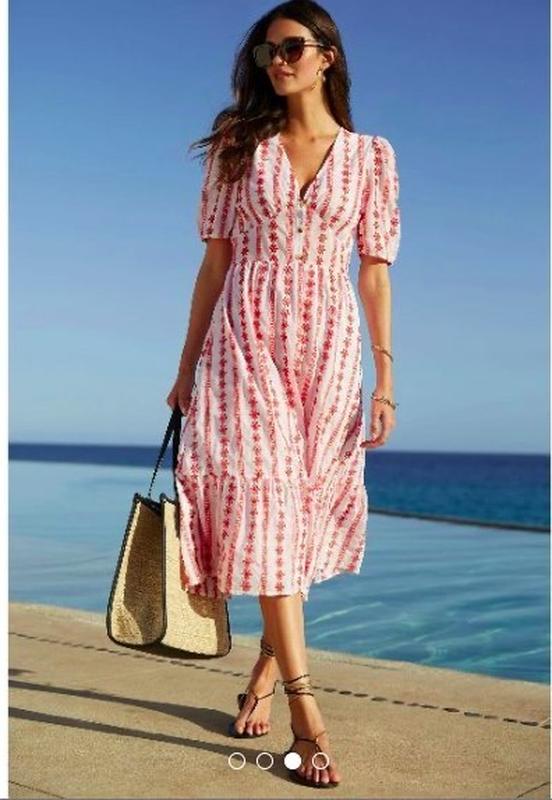 Легка романтична літня сукня міді довжини з ніжним квітковим принтом на білому фоні. Модель із глибоким V-вирізом та ґудзиками спереду, підкресленою талією і розкльошеною спідницею з воланом внизу. Об’ємні рукави-баф додають жіночності та трендового вигляду.