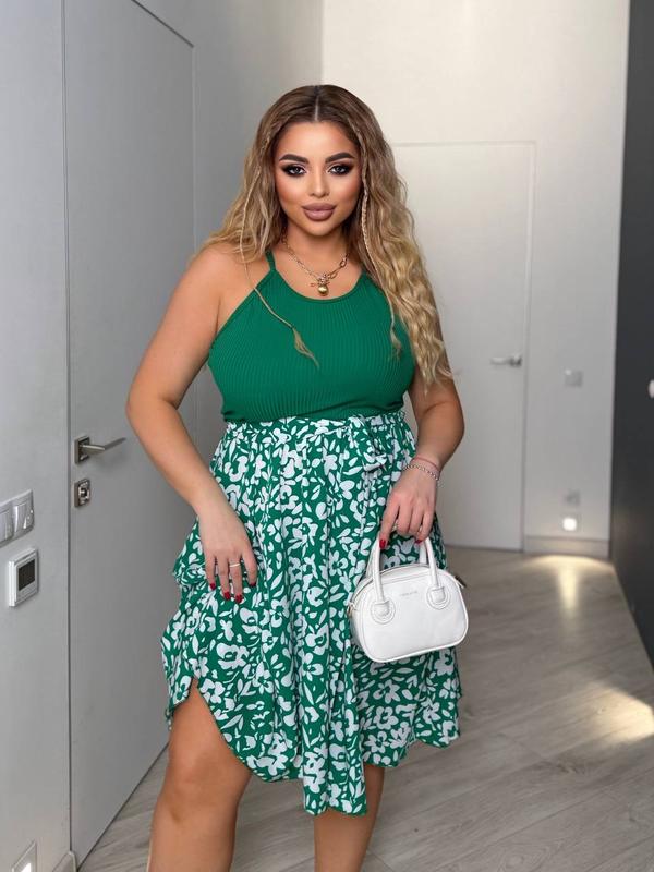 Сукня Код: 264 Тканина: спідниця- супер софт принт, топ- рубчик літній. Кольори: чорний, білий, єлектрик, трава. Розміри: 48/50,52/54,56/58,60/62. Виміри: 48/50: ог-90, от-70=116, довжина-103. 52/54: ог-98, от-72=128, довжина-103. 56/58: ог-106, от-76=140, довжина-103. 60/62: ог-112, от-80=148, довжина-103.