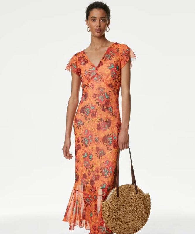 Новое шифоновое платье миди в принт из 100% полиэстра от Marks & Spencer. Прямой, приталенный крой, v-обращенный вырез, короткие рукава-крылышки и волан по низу. С подкладкой-комбинацией. Подкладка от второго бренда- Uniqlo, так как при покупке подклад был поврежден. Размер 12/40 Состав : 100% полиэстер Подкладка Uniqlo: - 56% полиэстер 44% переработанный полиэстер Длина - 126 ПОГ - 48-56 ПОТ - 41-48 ПОС - 53-61 Плечи - 36 Рукав - 16