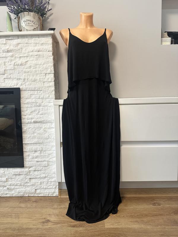 Сукня на фото — елегантна чорна максі-сукня на бретельках. Модель має вільний крій із двошаровим верхом, що додає легкості та підкреслює зону декольте. Виготовлена з легкої, м’якої тканини, яка гарно спадає вниз, створюючи витончений силует. Ідеально підійде як для повсякденного образу, так і для вечірнього виходу. 🔹 Розмір: 12 (UK) 🔹 Довжина: 150 см 🔹 Об’єм грудей (ПОГ): 54 см 🔹 Об’єм бедер: 63 см Чудовий варіант для спекотної погоди — зручна, стильна й універсальна сукня. Не забудьте підписатися на мій профіль,тут завжди можна знайти великий вибір одягу,оновлення щотижня і діють завжди знижки