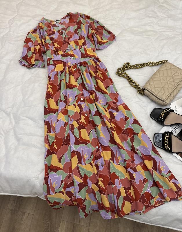 Платье миди длины. Короткий рукав. На пуговицах. Низ свободного фасона. Есть один незаметный нюанс на рукаве ( на фото показала). Замеры: грудь46 см, талия 39 см, в бедрах свободно, длина 113 см.