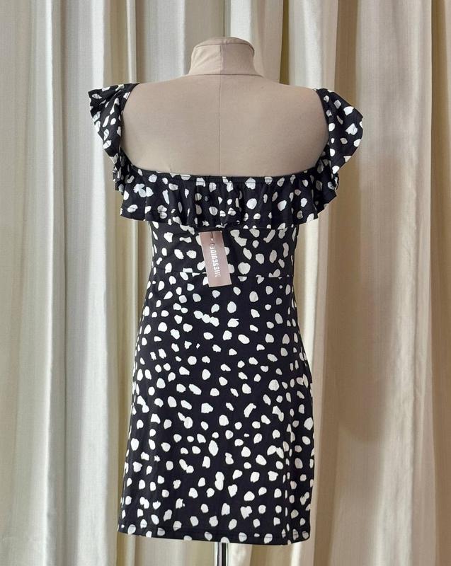 Сукня трикотажна графітового кольору з білим візерунком MISSGUIDED🛍️❤️🔥 Розмір - UK 8-10/ EUR 36-38/ USA 4-6/ S-M / 44-46. Склад : 50% поліестер, 45% бавовна, 5% еластан. Виробник Пакистан. Сукня відрізна по талії. Плечі зрізані з вставкою резинки та короткий рукав з вставкою вгорі резинки. Ліф з рюшею. Додаткові заміри: повна довжина 70, висота ліфа (до талії 25 см, довжина від талії вниз 45 см), висота рукава-рюші 8 см, напівобхват грудей 38 см (повний обхват 76 см) і тягнеться до 100 см, напівобхват талії 35 см (повний обхват 70 см) і тягнеться до 90 см, напівобхват стегон 46 см (повний обхват 92 см) і тягнеться до 110 см.
