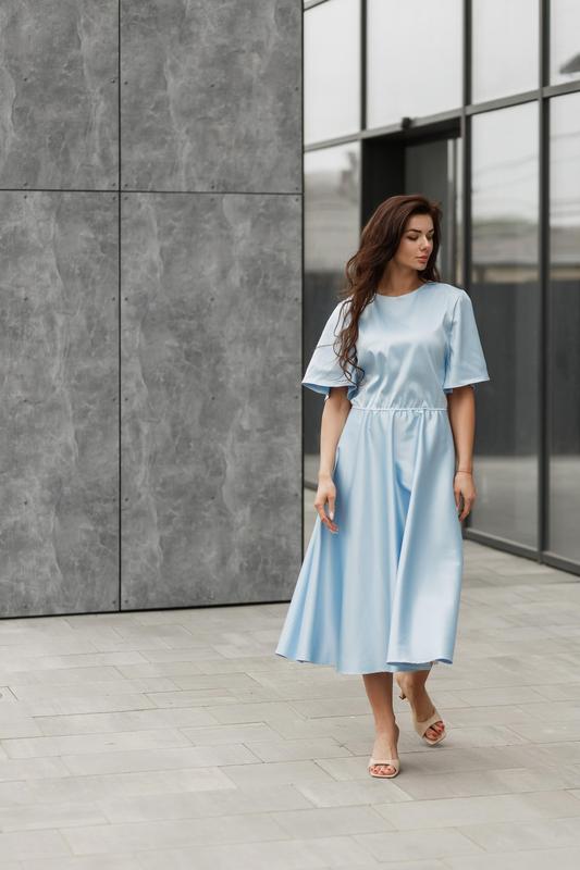 Сукня жіноча від бренду JO’DA . Довжина міді. Колір блакитний. Тканина шовкова, склад 97% поліестер, 3% еластан. Сукня має короткі розширені рукава , на талії резинка, до низу розширений крій. Немає блискавки. В наявності одна одиниця, розмір SM : ог 96-106, от 60-90(резинка), рукав 28, довжина 126. Модель чудово підійде на святкові події чи для офісу.