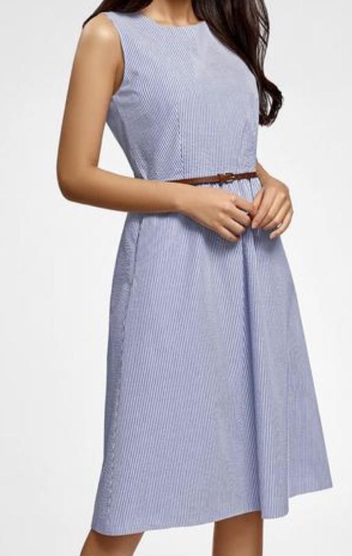 Розмір S Літня легка сукня 100 % коттон , тканина жатка в біло -блакитну тоненьку смужку ( трохи тягнеться -сідає по силуету) Довжина міді , кругла горловина Застібка на блискавку (на спині) 2 зручні кишені Не світиться : тонка біла підкладка (100 % коттон) Нова : не носилася . Бірка -зрізана ( планувала носити , але так сукня і пролежала в шафі) Можна вдягати з поясом ( в комплекті відсутній - згубився)