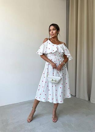 Новинка ❤️ Мод 363 Ткань: муслин Размеры: 42–44, 46-48, 50-52 Сезон: весна/лето Цена: 1100 грн Платье «Влюбенное лето» с открытыми плечами ❤️ Легкая, романтичная и нежная - идеальный вариант для жарких дней. 🔸 Фасон: свободный крой меди 🔸 Верх: открытые плечи с тонкими бретелями и глубоким воланом 🔸 Талия: эластичная резинка, подчеркивающая силуэт 🔸 Ткань: мягкий муслин с принтом красных сердечек 🔸 Стиль: женственный, праздничный, для свиданий, отдыха или фотосессий 🔸 Комфорт: дышит, приятная к телу Платье, которое влюбляет с первого взгляда 💫 имма