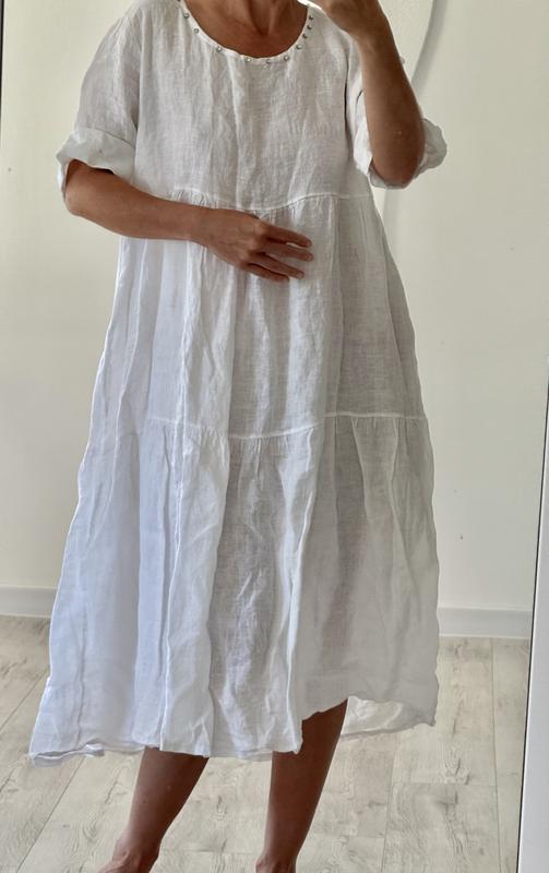 Платье из льна. Длина 117 см, ПОГ 57 см, ПОТ 57 см, бедра свободные, лен очень хорошего качества.Одененно на рост 165, вес 55 кг. Имеет круг шеи декор, из камней, очень блестят, при желании легко можно забрать, но очень красиво.