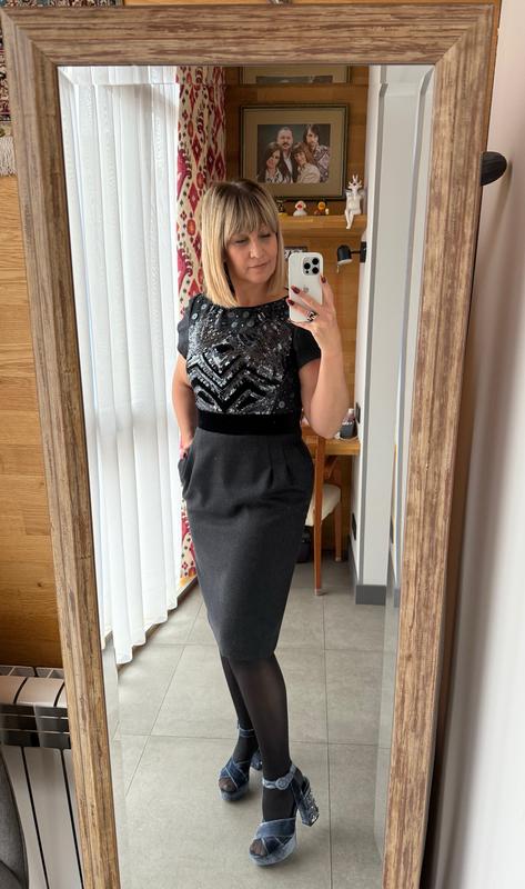 Сукня з вишивкою паєтками. Тонка вовна, на тонкий шовковий підкладці. Темно-темно сіра, майже чорна. Розшита вручну паєтками, намистами. Шила її на замовлення. Розмір М, але на S теж підійде (дивись заміри). Мені вона стала туговата, тому вимушена продати В боку блискавка, є пасок на кнопці, можна і без нього. Вишивка на чорному оксамиті, в боках кишені. Довжина 103см, в груді 48см, в талії 39см, в стегнах 52,5см, Мої параметри - зріст 164см, ОГ - 94ми, ОС - 100см. Дуже красива річ! Робить фігуру бездоганно! Ви така будете одна, точно ні на кому не побачите