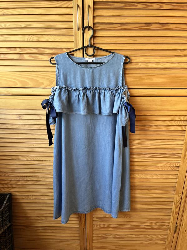 Синя джинсова міді-сукня - стильний вибір для будь-якої нагоди. Матеріал - денім, довжина - середня. Підкресли свій стиль з цією сукнею!