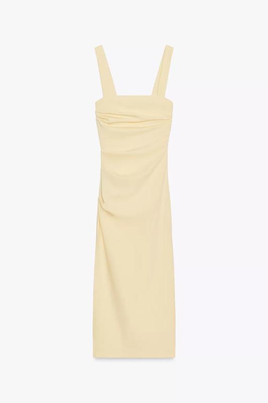 Приталена сукня міді. Прямий виріз і бретелі. Деталь із бічними складками. ЖОВТИЙ | 3641/848/300