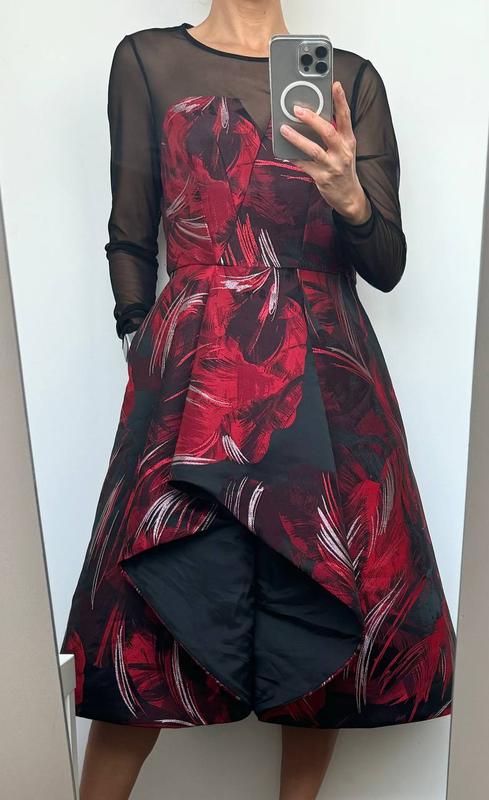 Платье в идеальном состоянии, с бирками. Очень актуальный крой и цвет черно-красный-бордовый. Размер указан 12. Длина 111, плечи 38, рукав 60, пог 47, пот 39-40