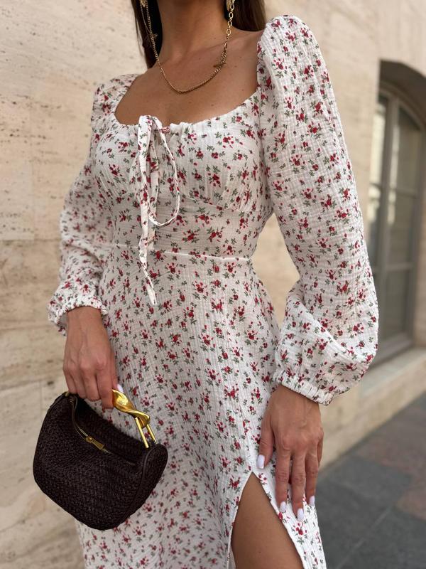 Женское летнее муслиновое платье миди в цветочек с декольте и длинным рукавом