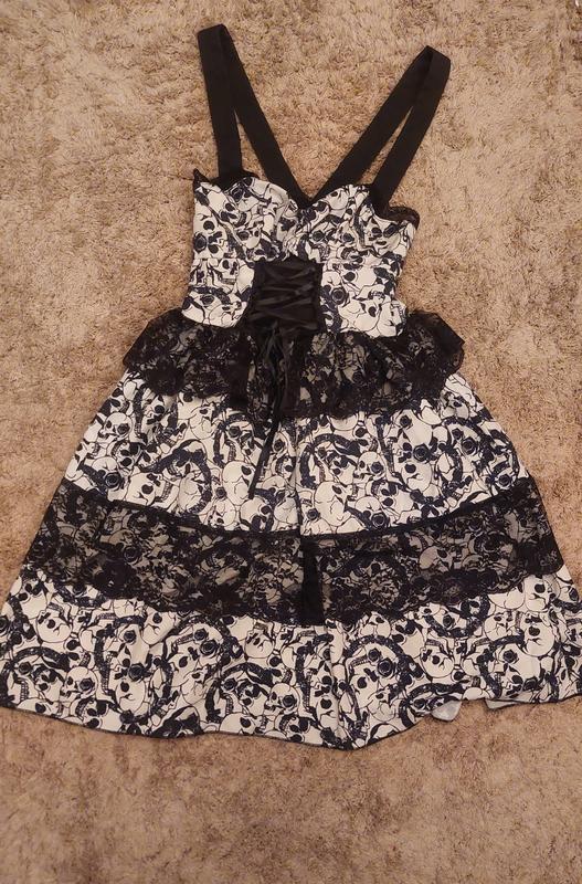 Платье летнее бело-черное с принтом с черепами на шнуровке размера XS, оборки из гипюра, сзади застежка молния. Стан идеален, одевалась несколько раз