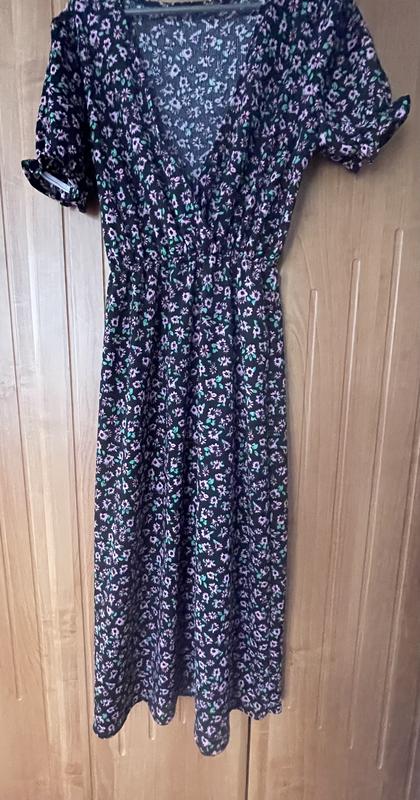 Стильна чорна сукня з відкритим декольте — ідеальний вибір для впевнених у собі жінок. Легкий короткий рукав додає образу свіжості, а довжина міді підкреслює витонченість фігури. Вишуканий квітковий візерунок робить цю сукню неповторною та жіночною. Розмір 42 забезпечує комфорт та ідеальну посадку. Ідеальна для вечірніх прогулянок або святкових подій.