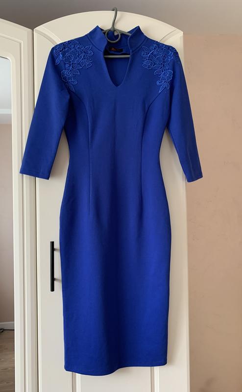 Синє плаття олівець довжиною міді, гарно лягає по фігурі, рукав 3/4, комірець стійка, ідеальний стан, з оригінальним оздобленням у вигляді квітів , цупка тканина Заміри довжина 105 см, довжина рукава 43 см, ширина між проймами 41 см, ширина по талії 30 см, ширина по стегнах 41 см, тягнеться