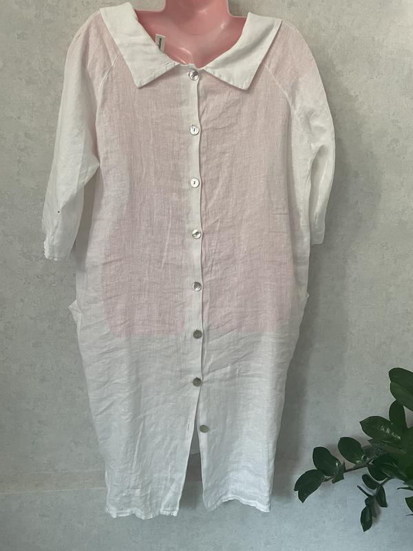 Лляна біла сукня-оверсайз “New Collection” Легка та зручна сукня в стилі оверсайз із натурального льону. Дуже приємна до тіла — ідеальний вибір для спекотної погоди Довжина- 85/92 см зад Груди ПО -60 см Рукав від шиї 45 си 🔸 Колір: білий 🔸 Матеріал: 100% льон 🔸 Фасон: вільний крій, короткий рукав 🔸 Довжина: нижче коліна 🔸 Декор: ґудзик з перламутровим ефектом, накладні кишені 🔸 Горловина: м’який широкий комір Сукня чудово підійде як для повсякденного образу, так і для відпочинку. Дихає, не сковує рухів, створює відчуття легкості. 📏 Орієнтовно розмір: універсальний (підходить на M–XL) 📸 Бренд: new collection Довжина- 85/92 см зад Груди ПО -60 см Рукав від шиї 45 си