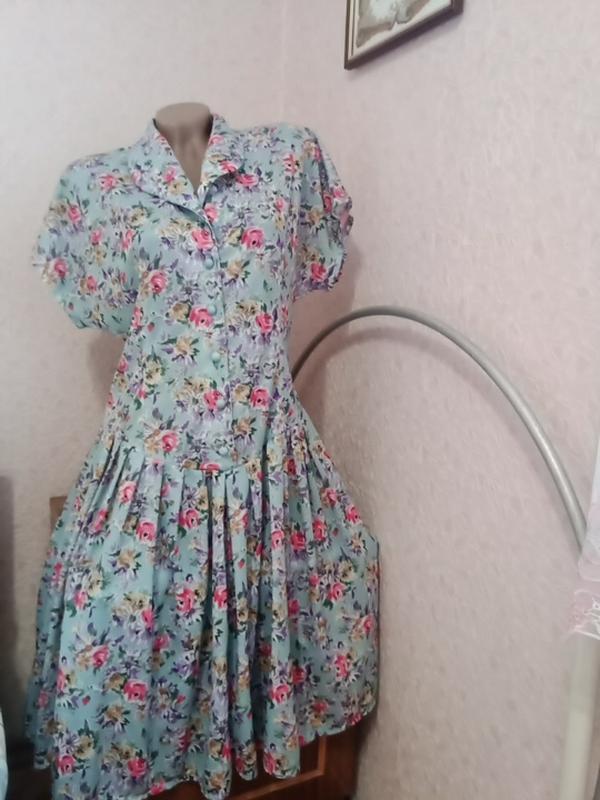 Платье красивого кроя великолепного бирюзового цвета с цветочным принтом. Есть отложной воротничок, рукавчик как продолжение плеча, застежка на пуговицы. Ткань полиэстер. Фасон приталенный с отрезком по заниженной талии. замеры в см: длина 105, до линии отреза 54, ширина в груди 52, в талии 43, в бедрах 55. Платье очень женственное и элегантное, красиво садится по фигуре. отлично подойдет на осень под жакет потому что ткань не летняя, достаточно толкающая.