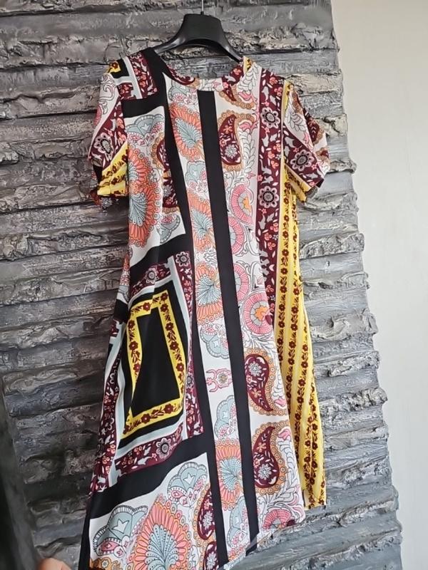 Комфортное платье с карманами РазмирМ, небольшой L.. Красивые цвета. Ткань практически не растягивается, сверяем замеры. Есть небольшая помарок, рисунок ткани на последнем фото, заметный при близком рассмотрении, в целом невидимый. Полуобхват груди 52 Полуобхват бедер 55 Длина 92