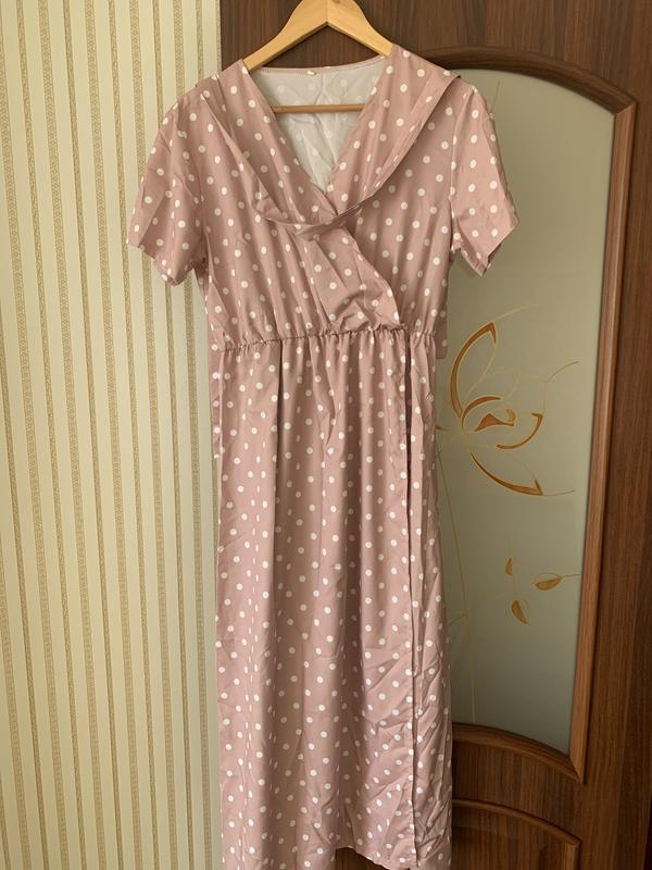 Сукня довга, пудра в білий горох, на запах, по талії резинка, є пасок