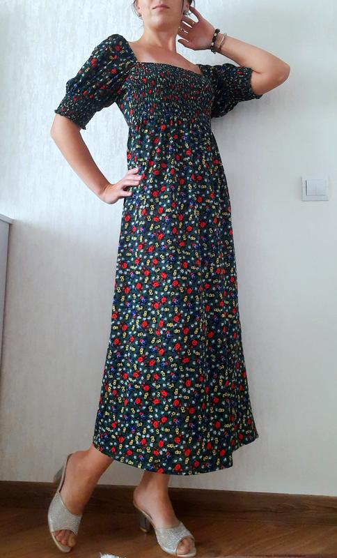 Самое легкое, легкое платье, длина миди, на груди и рукавах резинка. Идеальна на лето, очень нежный принт. п.о.г. 40 есть резинка тянется еще до 51 п.о.т 36 также тянется еще до 47 длина от рукава на плече 122