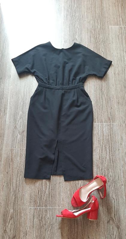 Платье миди с разрезом спереди и ектным v-образным вырезом сзади, и рукавами типа "летучая мышь. Материал типа костюм - не тянется. Есть кармашки. Длина 108, полуобхват и груди ориентировано 47 см, поталия 34 см. На спине замочек (в районе талии через стык тканы в районе талии немного туго застегивается, но рабочий). босоножки также продаются- размер 38- 39