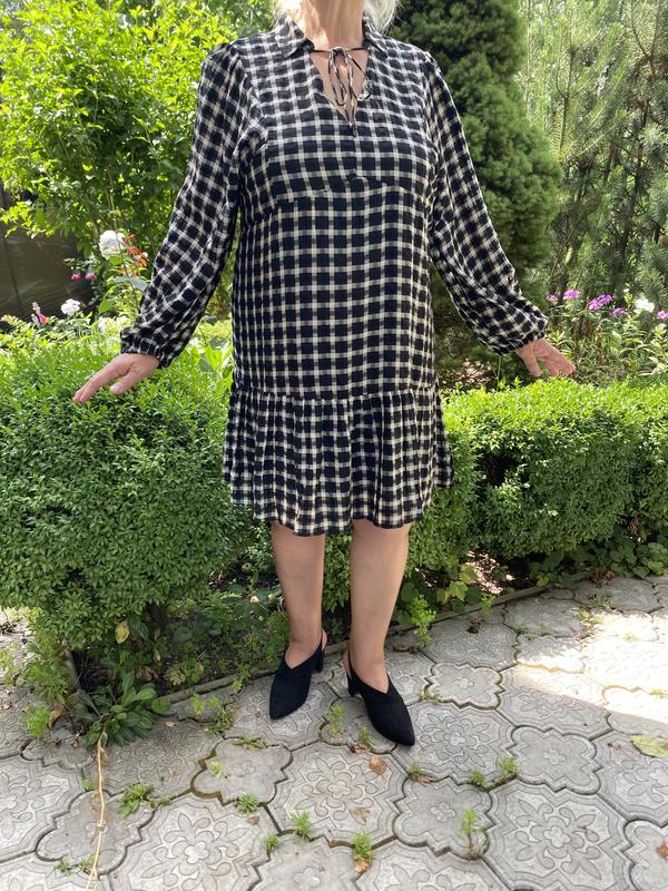Сукня чорно білих кольорів в клітинку, що при перетині утворюють інші відтінки ( сірого наприклад). Білий колір умовно, швидше айворі, або дуже світлий беж. Сукня вільного прямого силуету, має підріз під грудьми. По нижній частині широка оборка. Сукня має комірець, на грудях виріз мисиком, (досить глибоким) комір зʼєднується мотузочками, що додають романтичного вигляду. Рукава довгі і дуже широкі, внизу на резинці. Склад тканини поліестер 58%, віскоза 42%. Підкладка поліестер. Тканина сукні досить тонка, проти світла просвічується, намагалася показати на фото.Розмір вказано 18. Це мій розмір , я приміряю на 18(44), 165 см. На мене сукня до коліна, навіть трохи вище, здається на фото не помітно. Замовляйте безпечну оплату, дивіться заміри: НОГрудей 59 см Талія 61 см Довжина по спинці 90 см Рукав 65 см Ширина рукава по біцепсу 29 см Плече 10,5 см Сукня нова, у вжитку не була, з етикеткою.