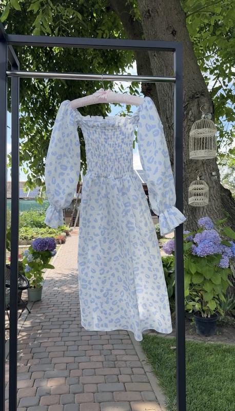 Муслінова довга сукня міді на резинці біла леопардова з довгим обʼємним рукавом бавовняна...