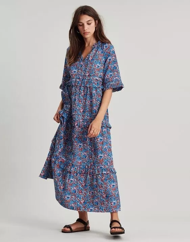 Длинное платье в цветочный принт с ярусной юбкой. По бокам есть кармашки. Рукав вшит регланом. Материал - тонкая, легкий хлопок. Размер указан 38/M, но маломерит. Для того, чтобы деревья примерно, как на модели, рекомендуют ее на размер 34/XS и рост +/-160. Замеры: полуобхват груди - 46 см полу охват завышенной талии - 44 см полуобхват бедер - 65 см длина - 126 см рукав от горловины - 39 см Состав: 100% хлопок