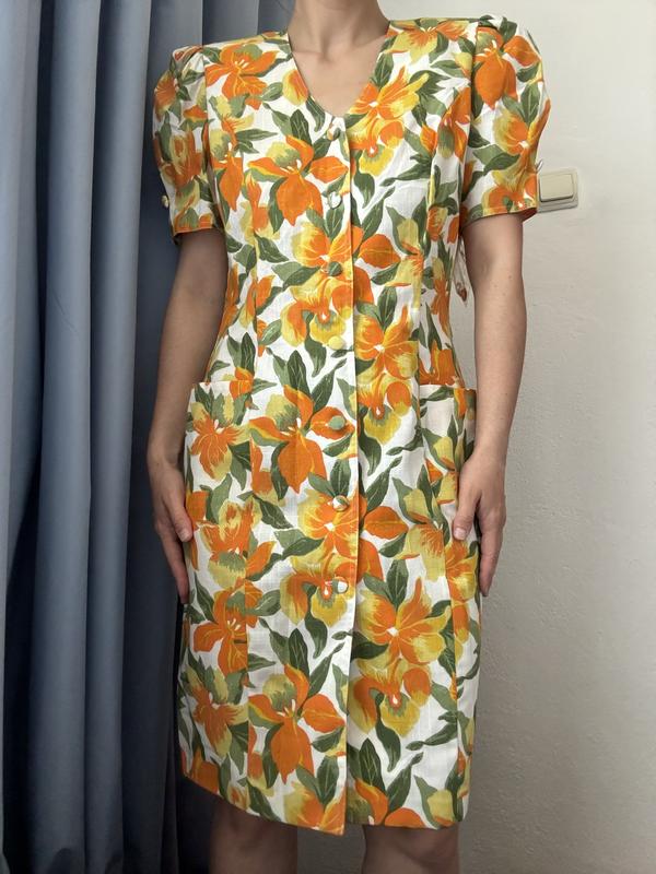 Красива вінтажна сукня Розмір М/L 50% віскоза Тримає форму Стан нового, є додатковий гудзик, прикріплений до рукава, що означає, що сукня не носилась Заміри: рукав-29 см, півобхват грудей-52 см, півобхват талії-42 см, півобхват бедер-53 см, довжина-101 см. Одягу на на розмір S