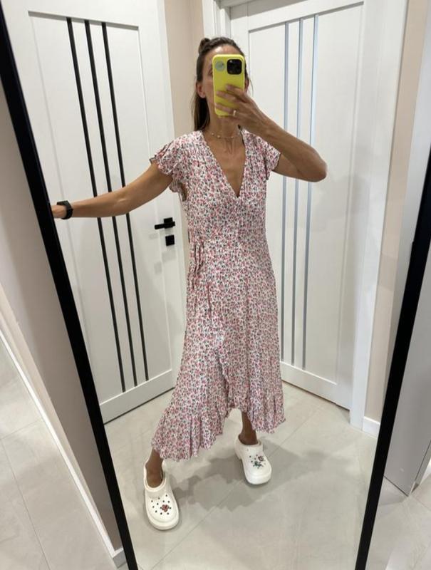 Цветочное платье M&S 100% вискоза Мои параметры: Окружность груди – 87 см. под грудью – 74 см. Обхват талии – 68 см Обхват стегон - 94 см Есть дефекты плечевых швов (2 последних фото), они маскируются за счет счет цветочного принта