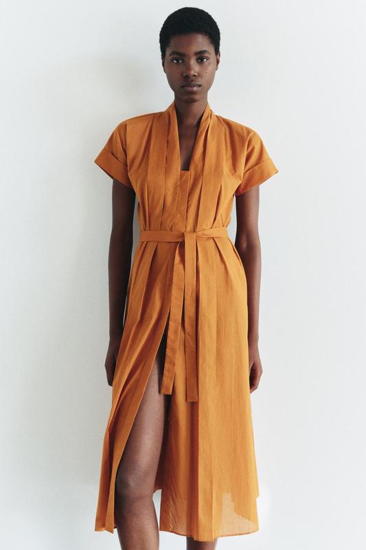 Платье средней длины из 100%-й штапельного хлопка с V-образным вырезом и короткими подвернутыми рукавами. Застегивается на пуговицы спереди. Защелье спереди и завязывающийся пояс на поясе. Состав: 100% органический хлопок, сертифицированный по стандарту OCS. М-ка: ПОГ 48 см, талия 45,5 см (фиксируете пояском), бедра свободно, длина 120 см.
