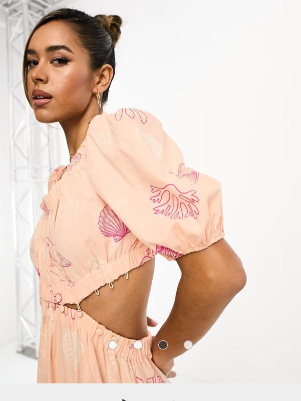 Платье миди 2 в 1 с эластичным вырезом, пышными рукавами и морским принтом ASOS DESIGN тканина котон цвет персик🍑 принт морской, красивый🪸🐚🦑 размер указан 8, но будет на м последнее фото на мне, Мои параметры: 96-80-102, рост 164. удобно