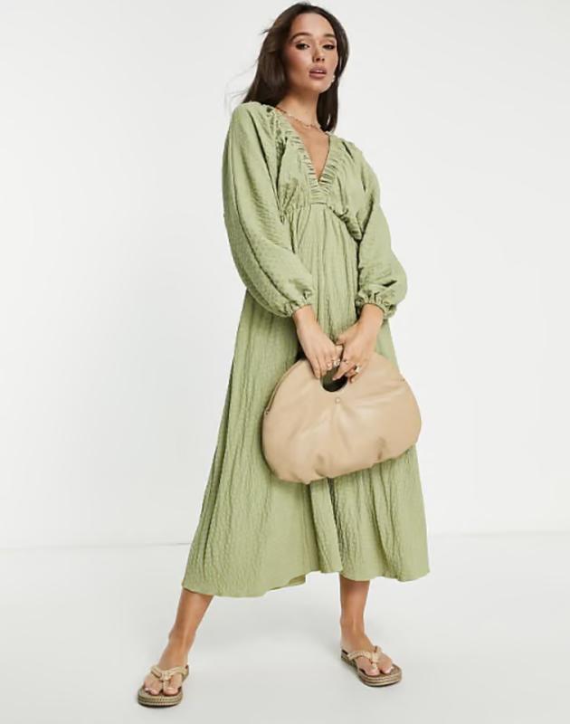 Сукня кольору оливи з рельєфної тканини Asos💚 Вільний крій, лінія під грудьми, обʼємні рукави з резинкою. розмір універсальний,резинка гарно тягнеться,підійде на S-M