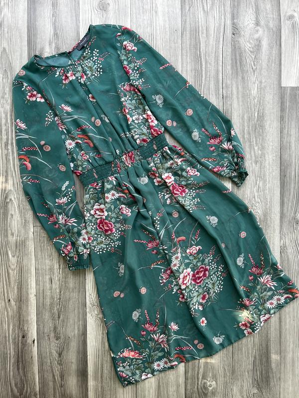 Легка та невагома шифонова сукня в квітковий принт. В талії та на рукавах має широку еластичну резинку. Стан чудовий. Без дефектів За біркою розмір 16, можна на менші параметри Вітаю! Довжина 110 Пог 55 Пот на резинці від 35 до 50 Поб вільний орієнтовно більше 70 Рукав на манжеті 66 з резинкою Плечі 40