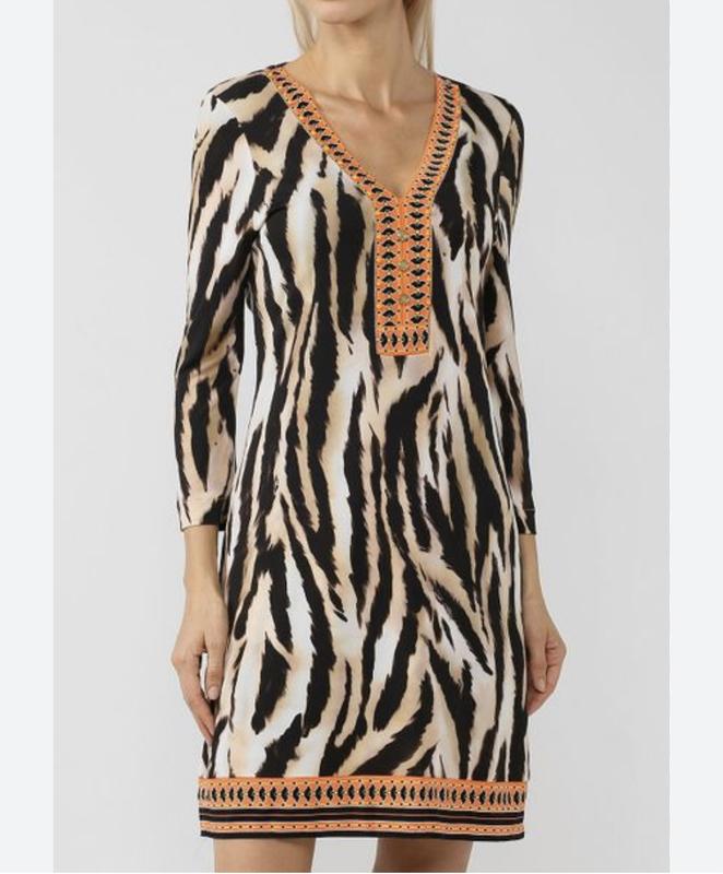 Пропонуємо чарівну сукню Marc Cain з віскози, шовку та джерсі. Має підклад, чудово сідає по фігурі завдяки еластичній тканині. Спереду оздоблена камінцями та моніллю, принт — оригінальний і виразний. 📏 Розмір L (брендовий розмір 5). Стан ідеальний. Дуже ефектна річ — не пропустіть!