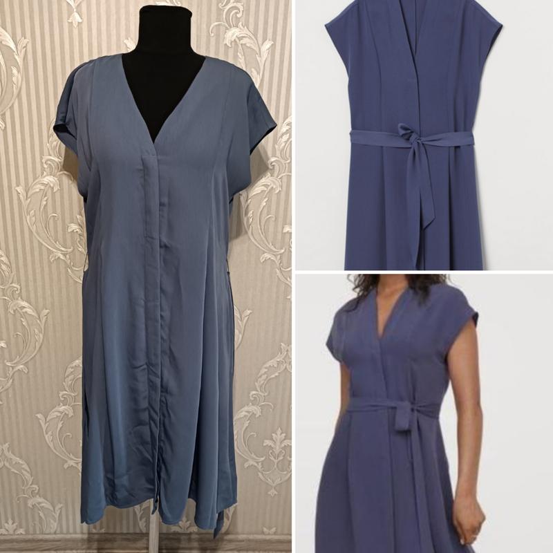 174 Стильное легкое платье Можно носить и с поясочком и без Гудзики прикрыты по планке Ткань легкая, хотя и полиэстр, но приятная на ощупь Стан - идеальный Дефектов нет Замеры: ПОГ 49 см ПОТ 49 см ПОБ 65 см По низу ПО 75 см Длина от плеча 99 см Длина от подмышки 70 см