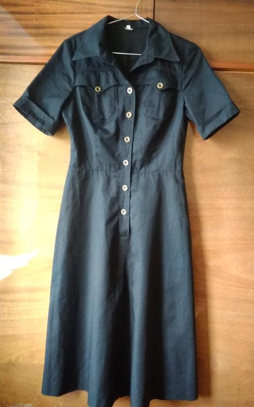 Винтажное платье, стиль casual. Брендированные металлические пуговицы. Можно носить с пояском, имеет подкладку. Цупка тканина Плечи 38, грудь 40-42, рукав 25, длина до талии 37, общая длина 108, талия 35