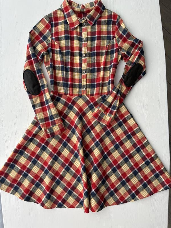 сукня сорочка- юбка сонце у клітинку шерсть. Збоку потаємний бігунок, по переду до талії ґудзики. На ліктях латки декоративні. Тканина шерсть. Розмір XS-S
