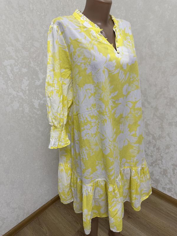 Ніжнолимонна котонова сукня з рюшею Виміри: ПП 45 ПГ 60 ПТ 64 ПС 70 Довжина 93 Рукав 46
