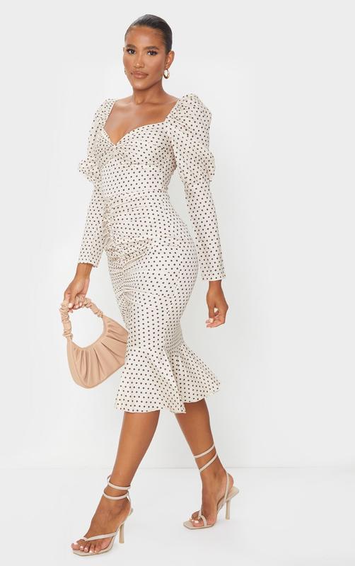 Очень красивое элегантное платье. Цвет нюдовый, горох коричневый. Застегивается на молнию по спинке. Размер указан 14/42. Тканина - 100% ПЕ.