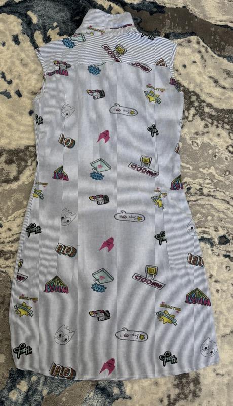 Платье-рубашка в вертикальную полоску с принтом. Заміри видно на фото.